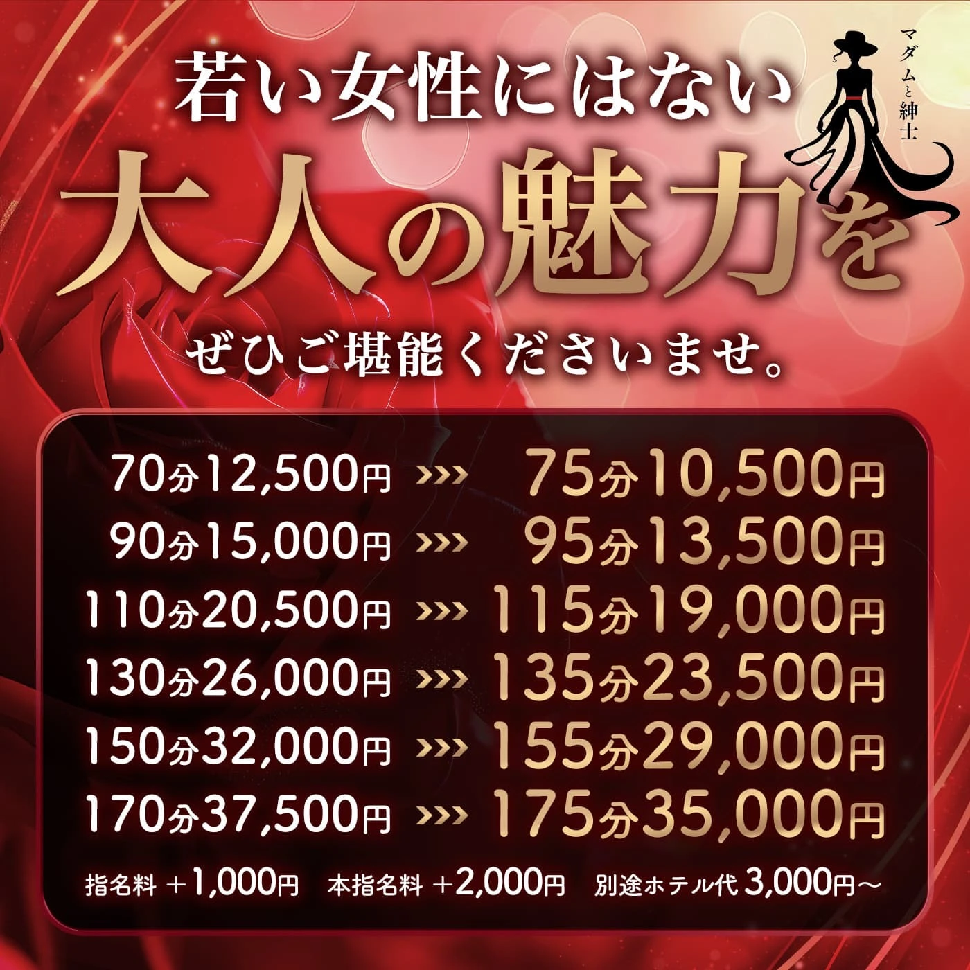 マダムと紳士だからこそ味わえるエロスと密着施術を体感してください。